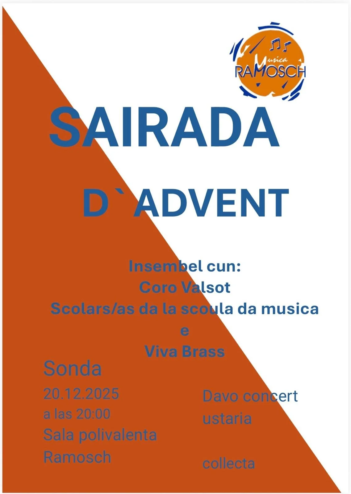 Home Evenimaints Musica Evenimaints Sairada d’andvent sala polivalenta a Ramoschsonda ils 20.12.2025 davent da las 20.00Entrada libra cun collecta